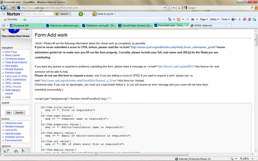 However, when visiting http://www.cpdl.org/wiki/index.php/Form:Add_work, the form does not display properly. It shows up as all code, in both IE and Firefox. Here is a screenshot: