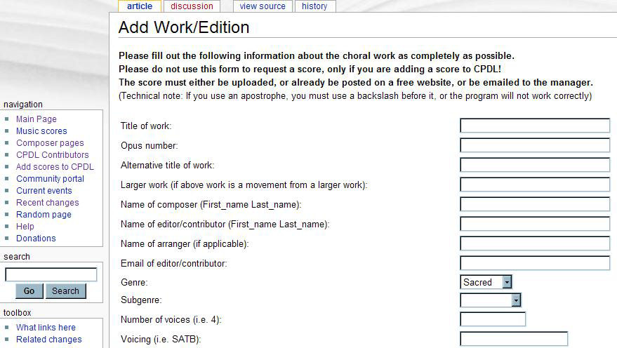 We yesterday upgraded the MediaWiki software to a new version. The "add work" form is quite a critical page, as it is rather complex and it makes use of a special MediaWiki extension that is not used by any other pages at ChoralWiki. We tested the upgrade on a test server before upgrading the "live" ChoralWiki, and there was no problem with this page, while a problem apparently showed up when the upgrade was performed on the real server. No doubt: Mr. Murphy is always right!